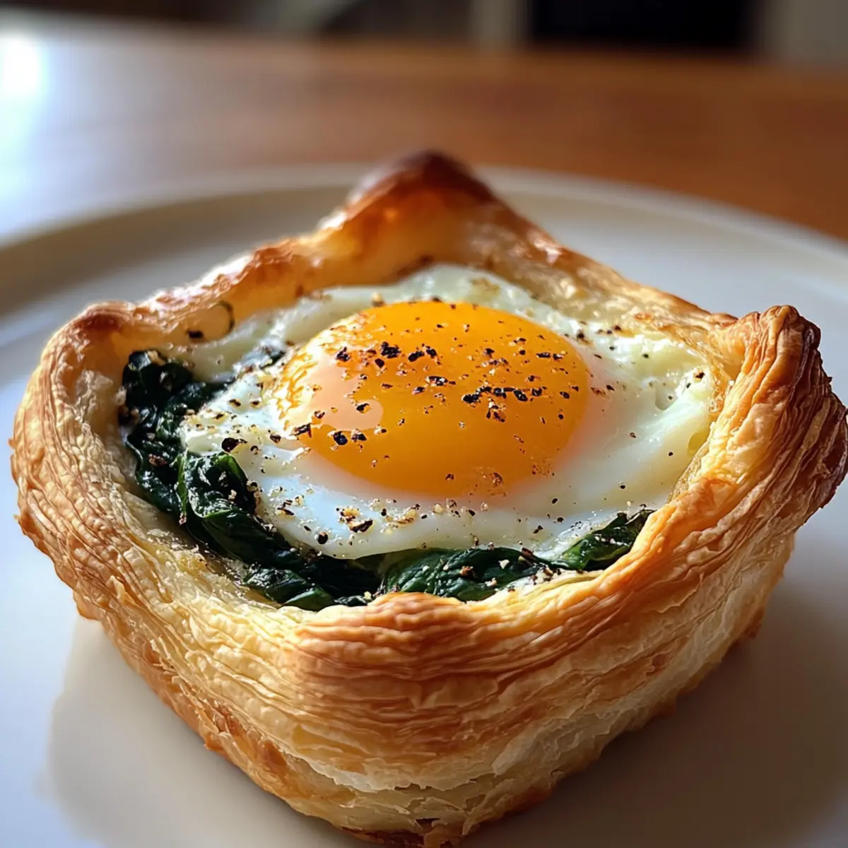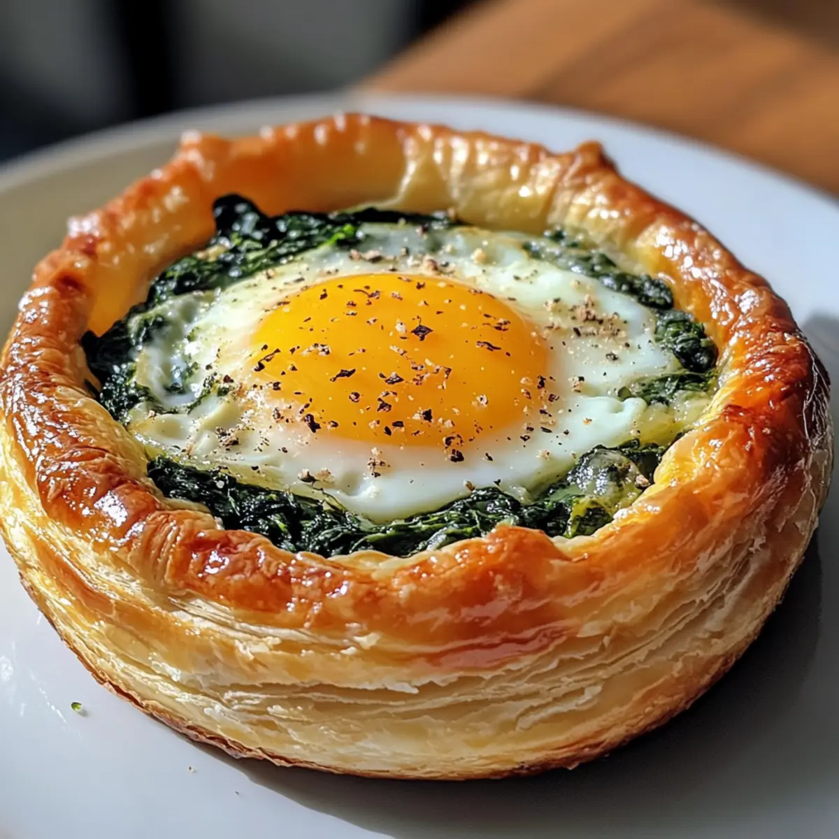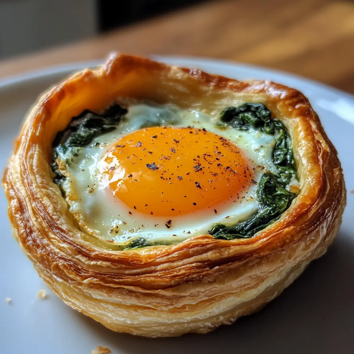 - Spoon the spinach filling into each pastry shell, create a well in the center, and crack an egg into each well. Season with salt and pepper.