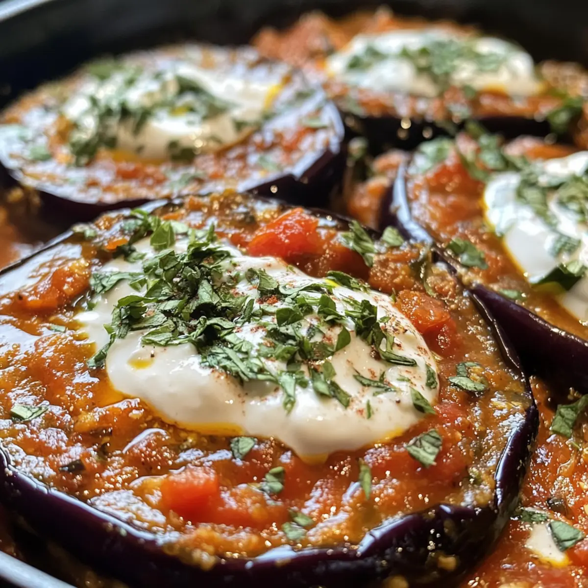 - Layer fried eggplant in a serving dish, drizzle with tomato sauce, and spoon herbed yogurt on top before serving.
