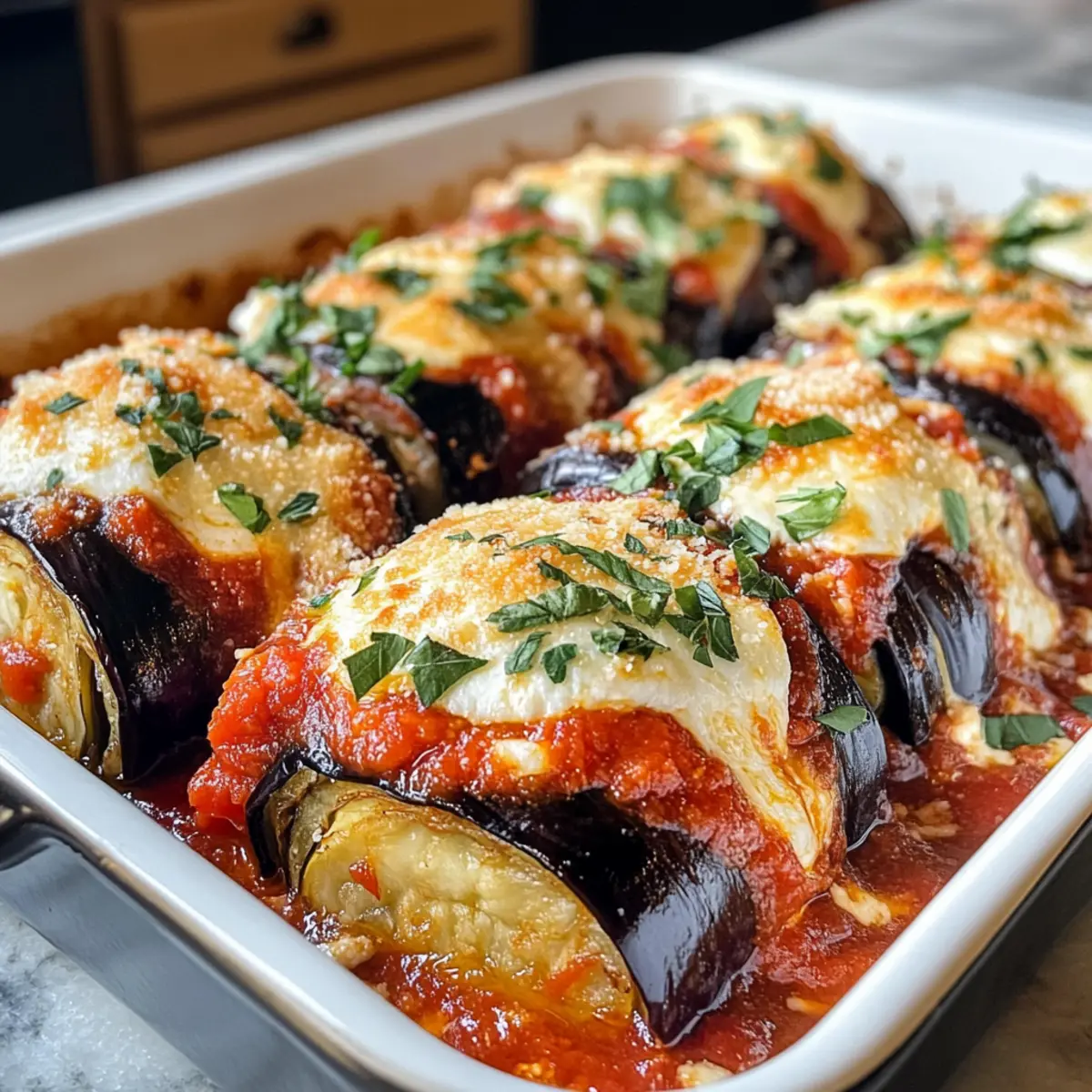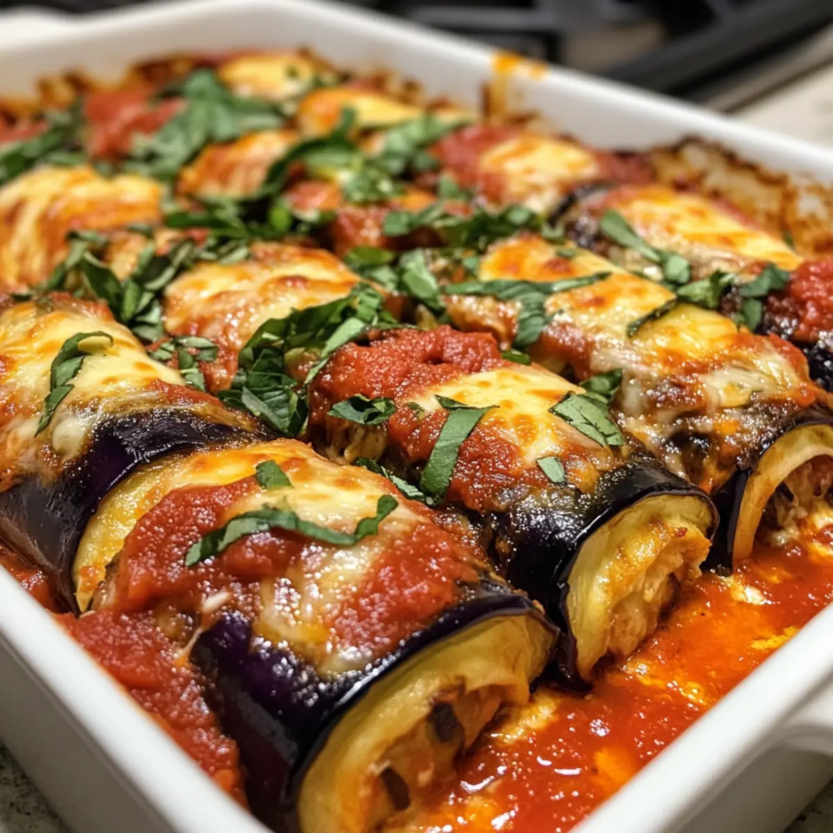 Once baked, remove the Eggplant Rollatini from the oven and let it cool slightly—just enough to handle it. Garnish with additional fresh basil for that pop of color and flavor. Now, your stunning dish is ready to impress family and friends at the dinner table!