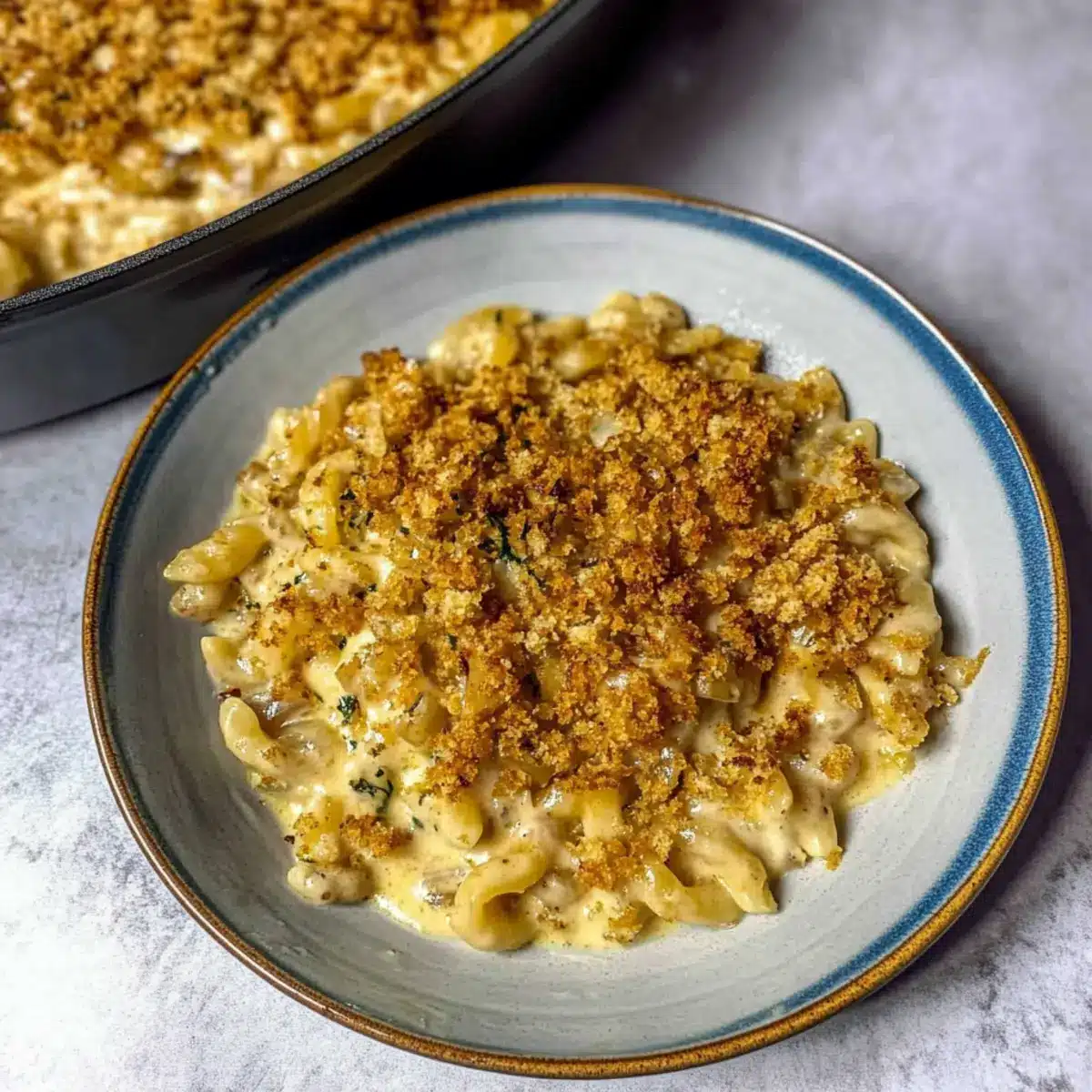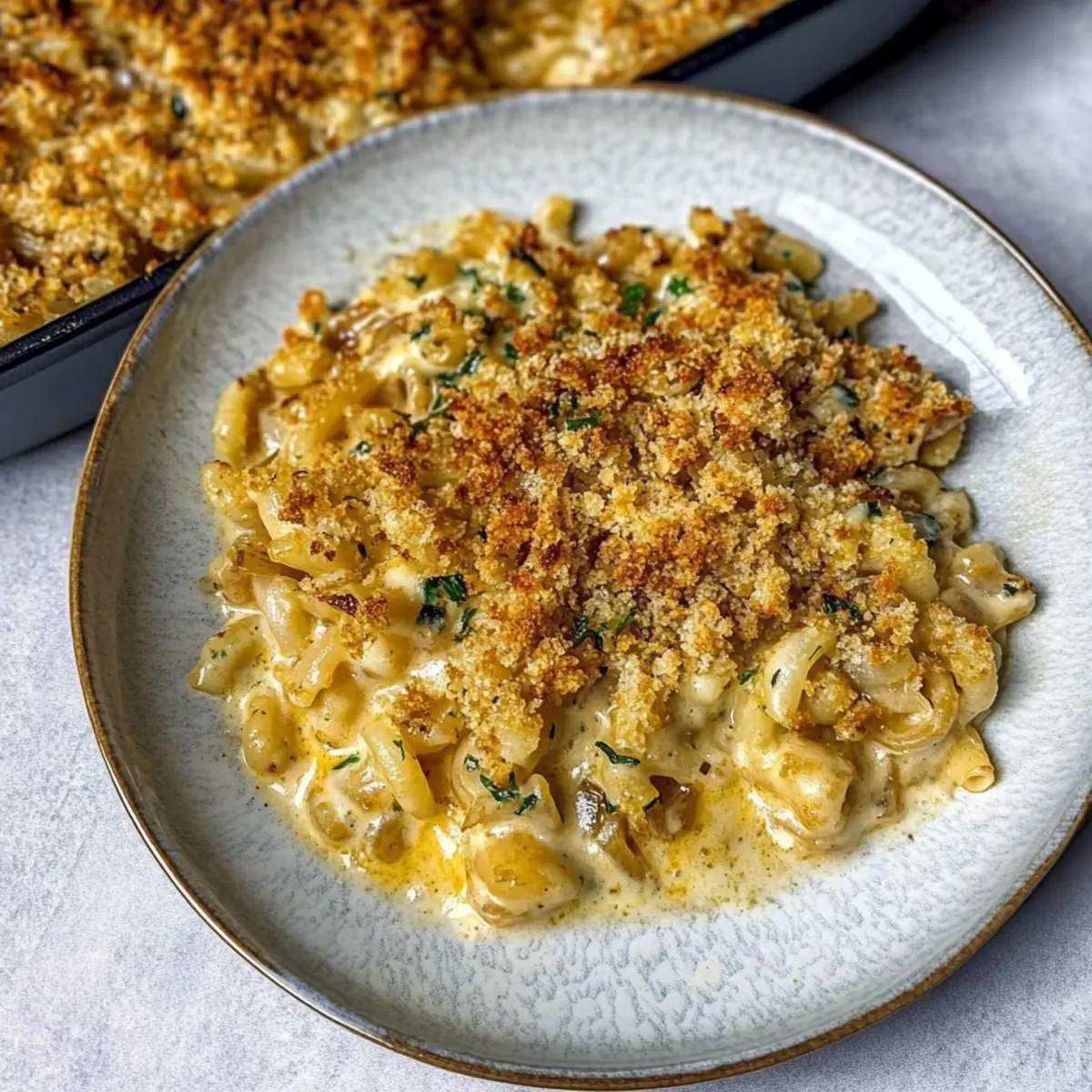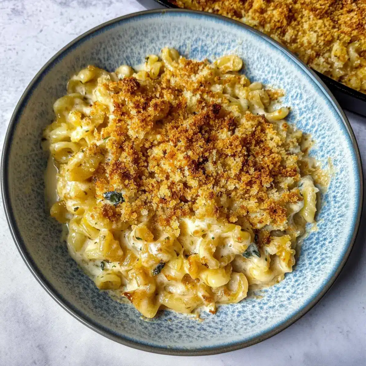 These Creamy French Onion Soup Pasta preparations are perfect for busy weeknights or planned gatherings! You can caramelize the onions and prepare the béchamel sauce up to 3 days ahead. Simply store the onions and sauce separately in airtight containers in the refrigerator. To maintain their quality, let the béchamel cool completely before covering, as this prevents moisture buildup. When you’re ready to enjoy this comforting dish, reheat the onions and sauce on the stove while boiling fresh pasta. Combine everything in a baking dish, top with breadcrumbs, and bake for about 10-15 minutes until golden. This way, you’ll serve up that same warm, indulgent flavor with minimal weekday fuss!