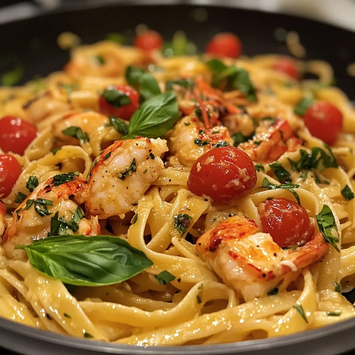 - Add the chopped lobster and halved cherry tomatoes into the sauce, gently tossing to combine. Simmer together for 2-3 minutes.
