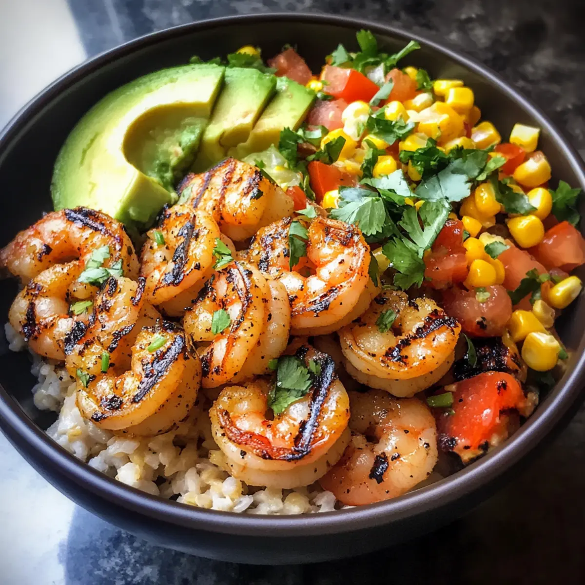 To assemble your Grilled Shrimp Bowl, start by dividing a hearty serving of your choice of cooked rice (white or brown) among individual bowls. Layer the flavorful grilled shrimp over the rice, followed by a generous scoop of the fresh corn salsa and slices of creamy avocado for a colorful presentation that excites the taste buds.