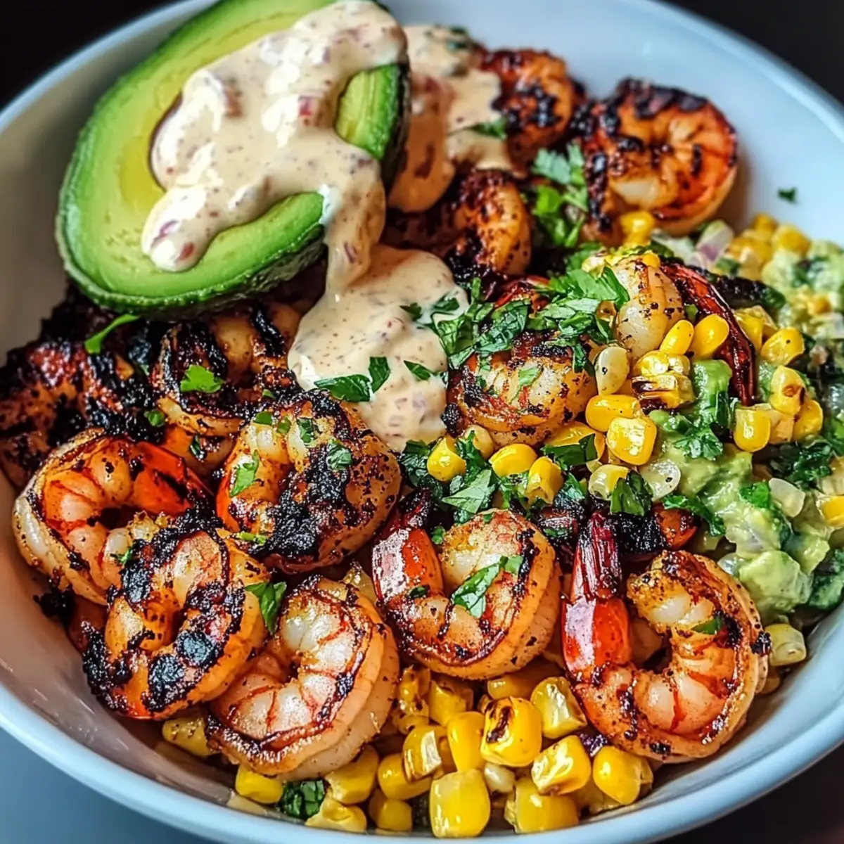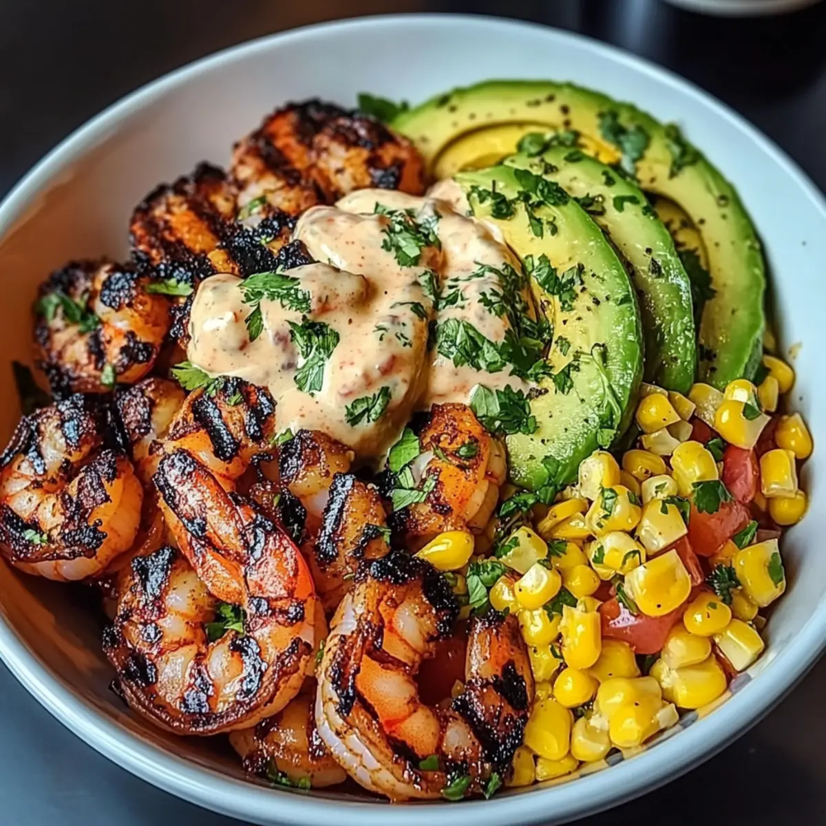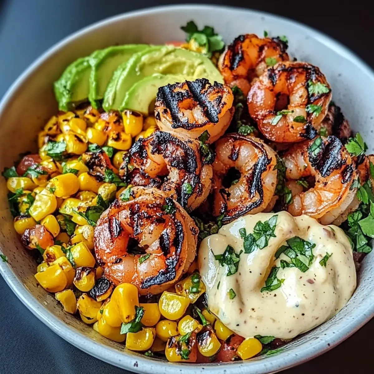 - To assemble your bowl, start with a base of corn salsa, add grilled shrimp, layer avocado slices, and drizzle with creamy garlic sauce.
