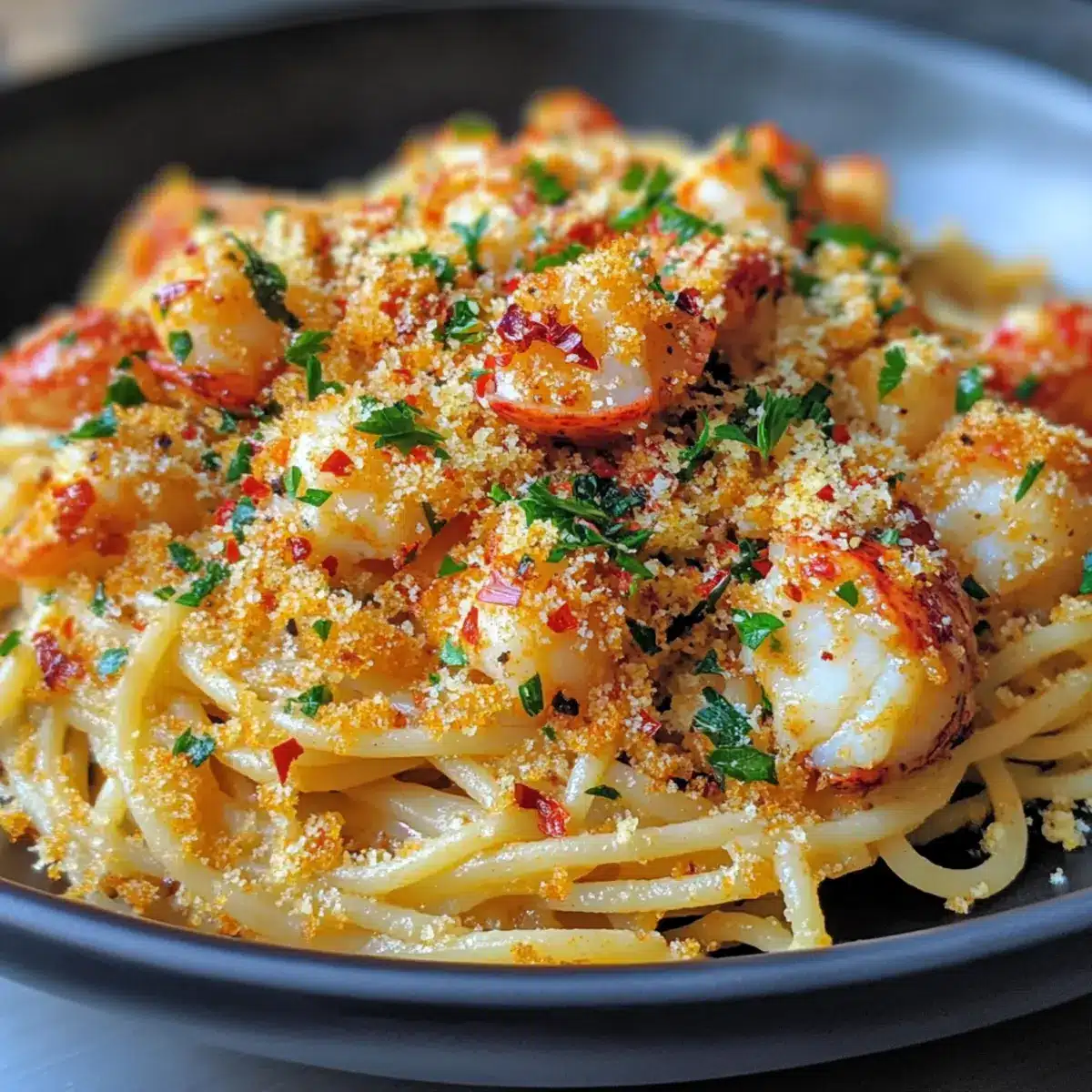 - Serve by plating the Lobster Spaghetti and topping with crispy chili breadcrumbs and parsley.