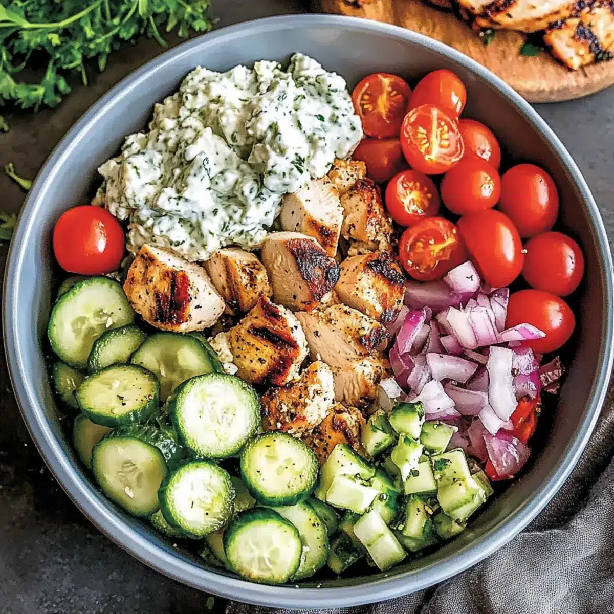 These Low-Carb Greek Chicken Bowls are ideal for meal prep enthusiasts! You can marinate the chicken up to 24 hours in advance, ensuring maximum flavor. Simply combine the chicken with olive oil, lemon juice, red wine vinegar, Greek seasoning, and salt in a sealable container for optimal taste. The Tzatziki sauce can also be prepared up to 3 days before serving; just store it in an airtight container in the refrigerator. When you’re ready to enjoy your meal, cook the marinated chicken as instructed, assemble the bowls with your prepped toppings, and drizzle with dressing. This make-ahead approach saves time and guarantees each bite is just as delicious!