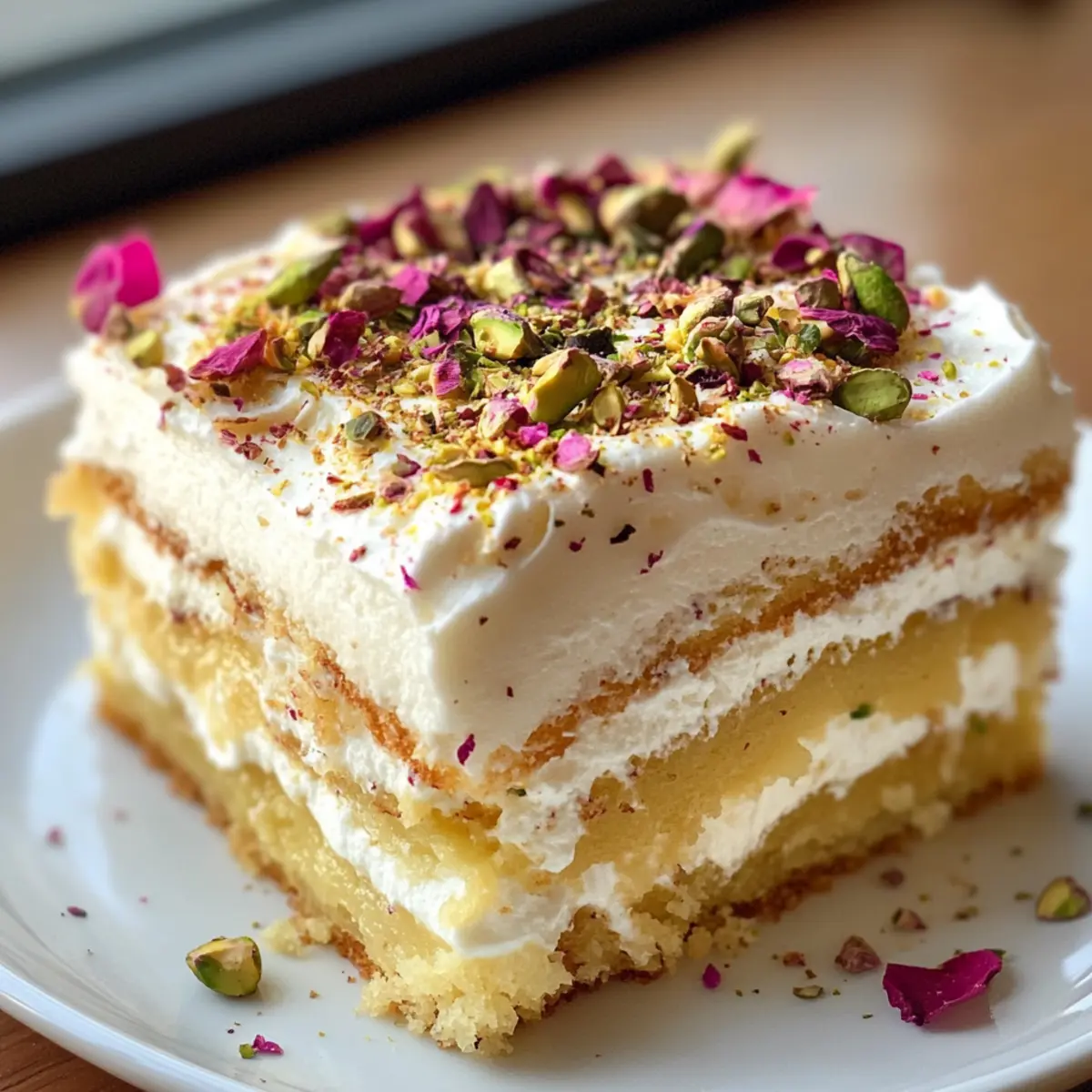 - Sprinkle crushed pistachios and dried rose petals over whipped cream. Slice and serve chilled.