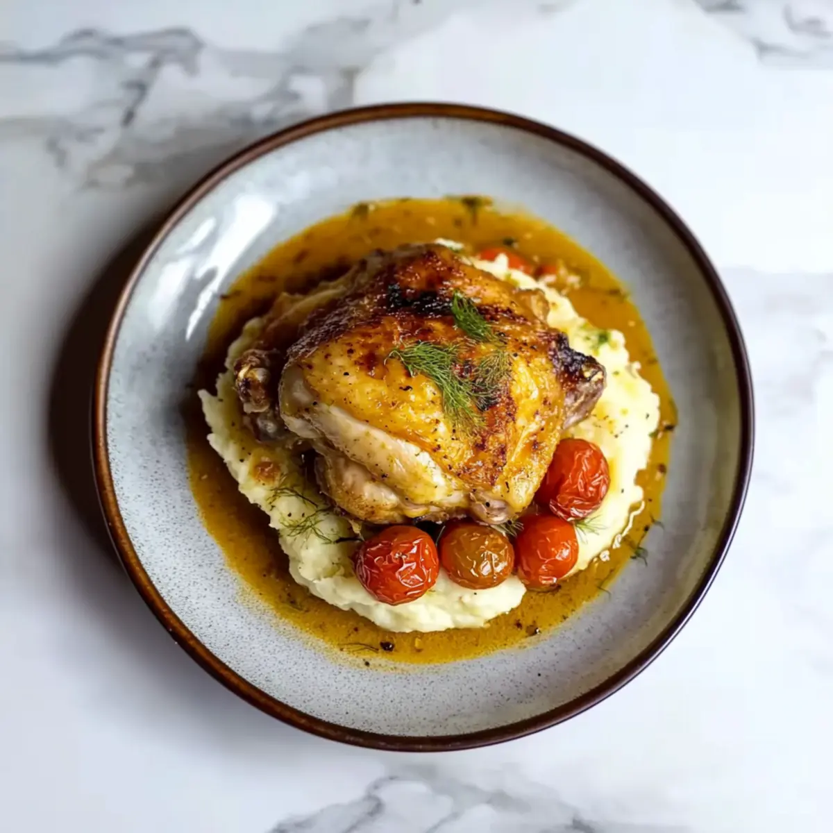 While the chicken is roasting, reheat the creamy mashed potatoes gently on the stove. Once the chicken is cooked, remove it from the oven and let it rest for a few minutes. Serve the golden roast chicken alongside the savory vegetable mixture and a generous scoop of mashed potatoes. Garnish with fennel fronds and a sprinkle of extra pepper flakes, if desired, for a beautiful and inviting presentation.