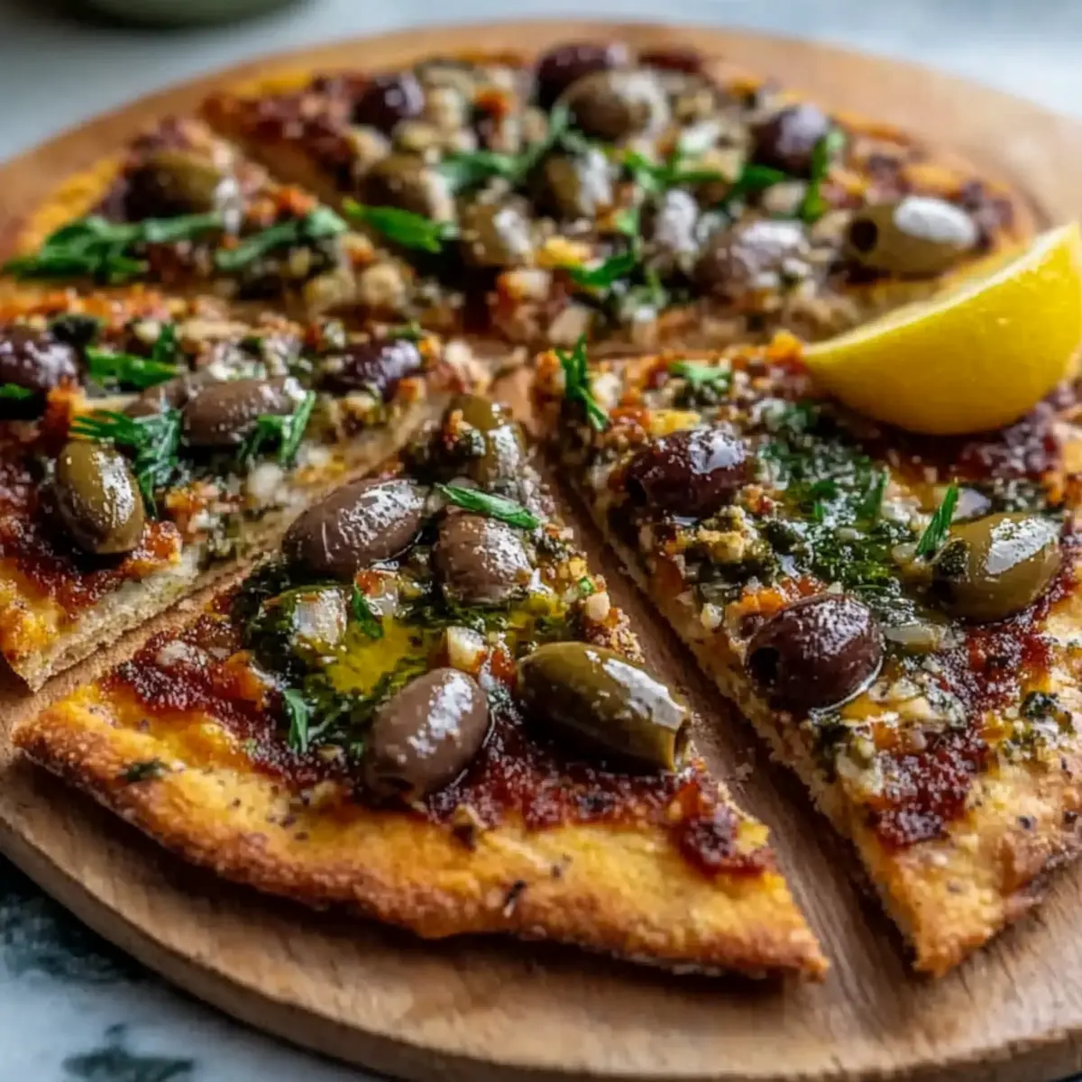Once the flatbread is slightly cooled, spread a generous amount of the tapenade over the warm surface. Use a sharp knife to slice the flatbread into wedges, showcasing that luscious spread. Serve immediately and enjoy the delightful combination of flavors while it’s fresh and warm!