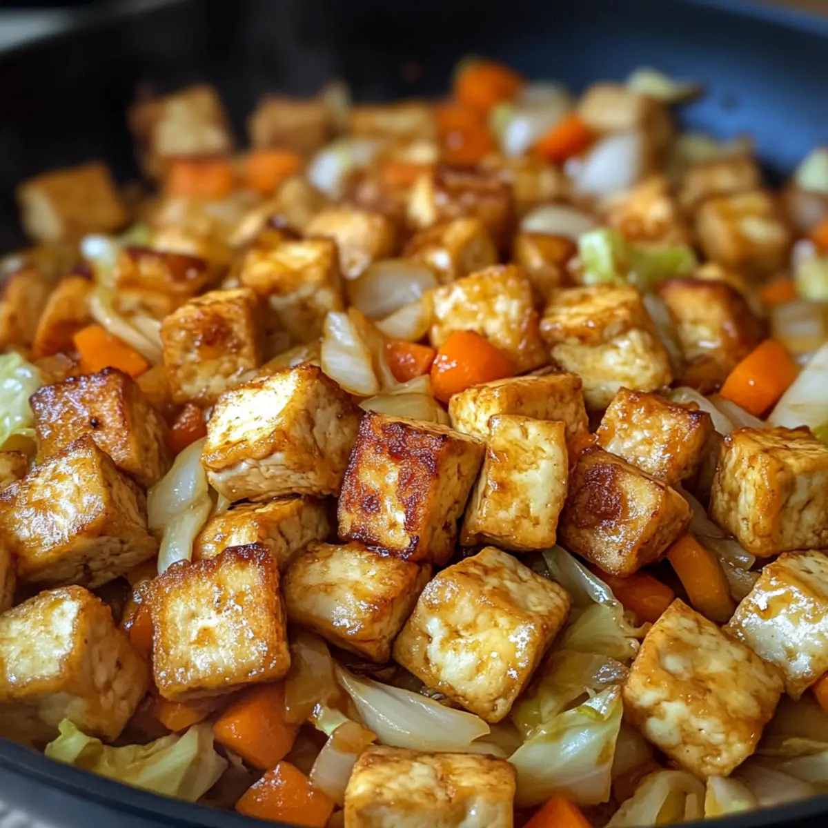 - Remove the tofu from the skillet and set aside. In the same skillet, add chopped cabbage and sliced carrots; stir-fry for about 3–4 minutes.