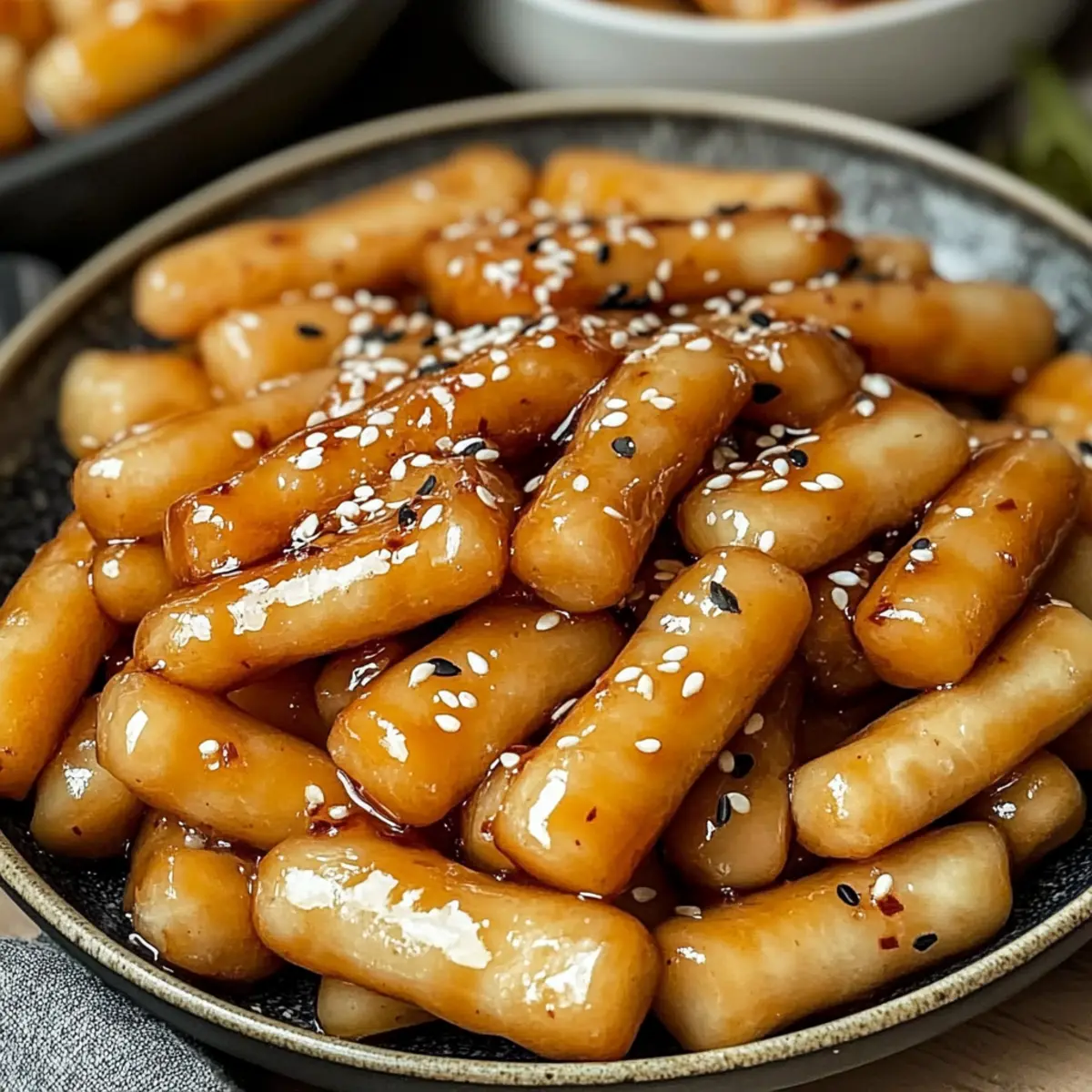 Return the crispy rice cakes to the pan and toss them gently in the sweet soy butter glaze. Cook for an additional 1–2 minutes, ensuring that each piece is well-coated and heated through. The sauce should slightly thicken, creating a rich and sticky coating. Serve the Sweet Soy Butter Korean Rice Cakes immediately, garnishing with optional sesame seeds or a drizzle of sesame oil for an extra touch of flavor.