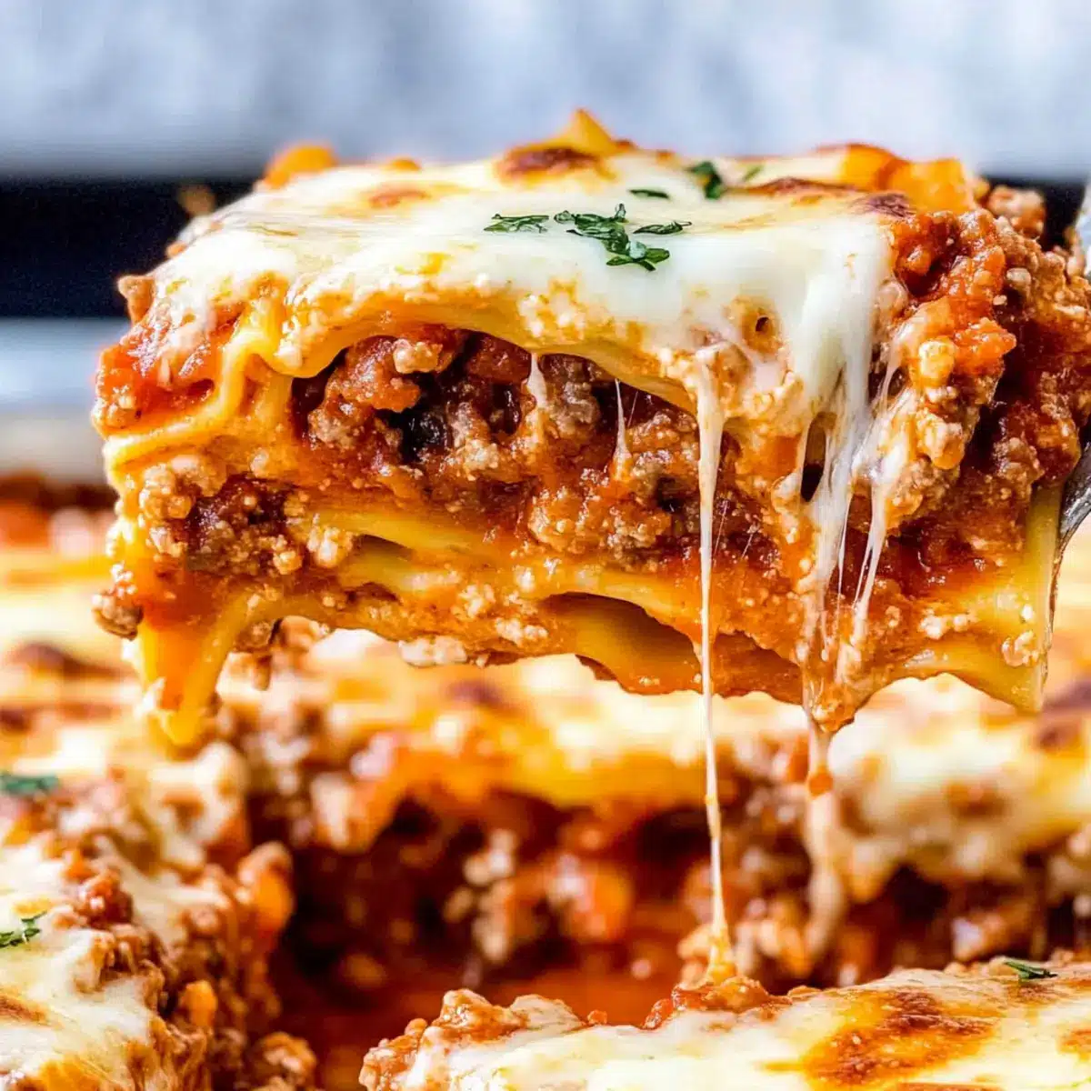 Comforting, Hearty Layers: This lasagna is a warm embrace on a plate, featuring decadent layers of beef, sausage, and creamy cheeses.