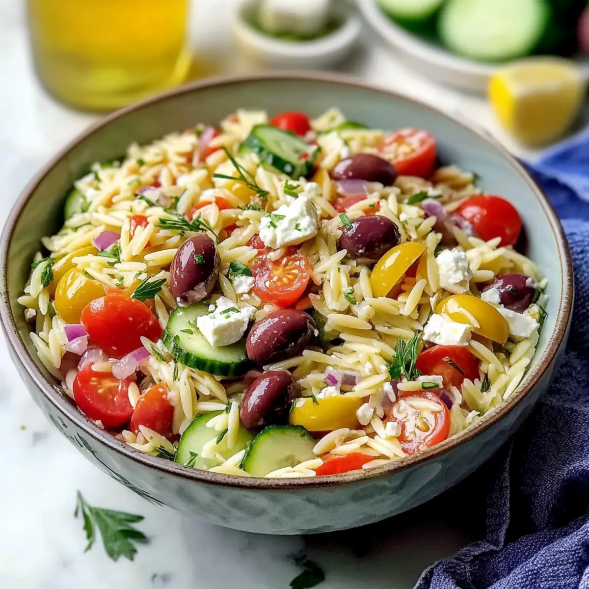 Absolutely! For a nut-free option, ensure to check for gluten-free orzo. If you’re avoiding dairy, you can replace feta cheese with crumbled tofu or a dairy-free feta alternative. This salad is incredibly versatile, so feel free to swap in your favorite veggies or ingredients to suit your needs!